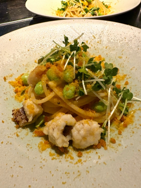 本日の〆パスタには、ハモ 枝豆 カイワレ カラスミのアーリオオーリオをご用意しております!