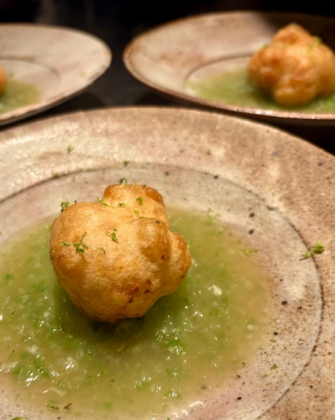 外はカリッと中はトロトロな白子のベニエに、青芯大根を合わせたコンソメスープ、香り付けにスダチのピールをかけた心も身体も温まるお料理です!