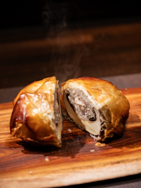 今回は地鶏のお肉で作ったソーセージを詰め、パートフィロで包みオーブン焼きに!
