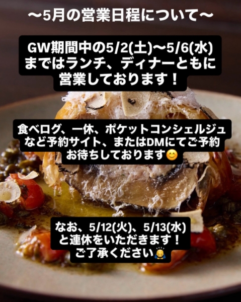 GW期間中の5/2(土)〜5/6(水)まではランチ、ディナーともに営業致します😊